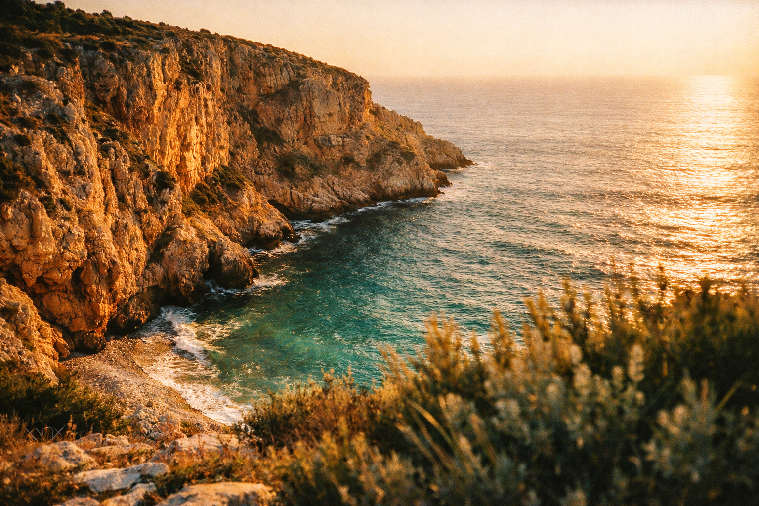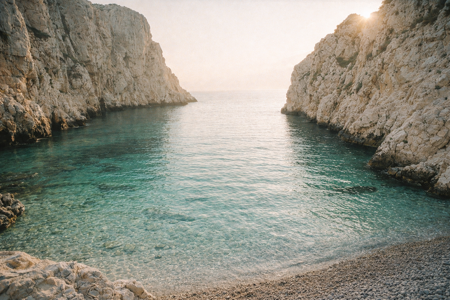 Cala La Granadella sits at the southern end of the town — a small bay of white gravel and rock, sheltered by cliffs on three sides, with water so transparent you can watch the seabed the entire way down. Arrive at dawn and the cove is silent. The cliffs catch the first light and hold it amber for about twenty minutes before it shifts to white.